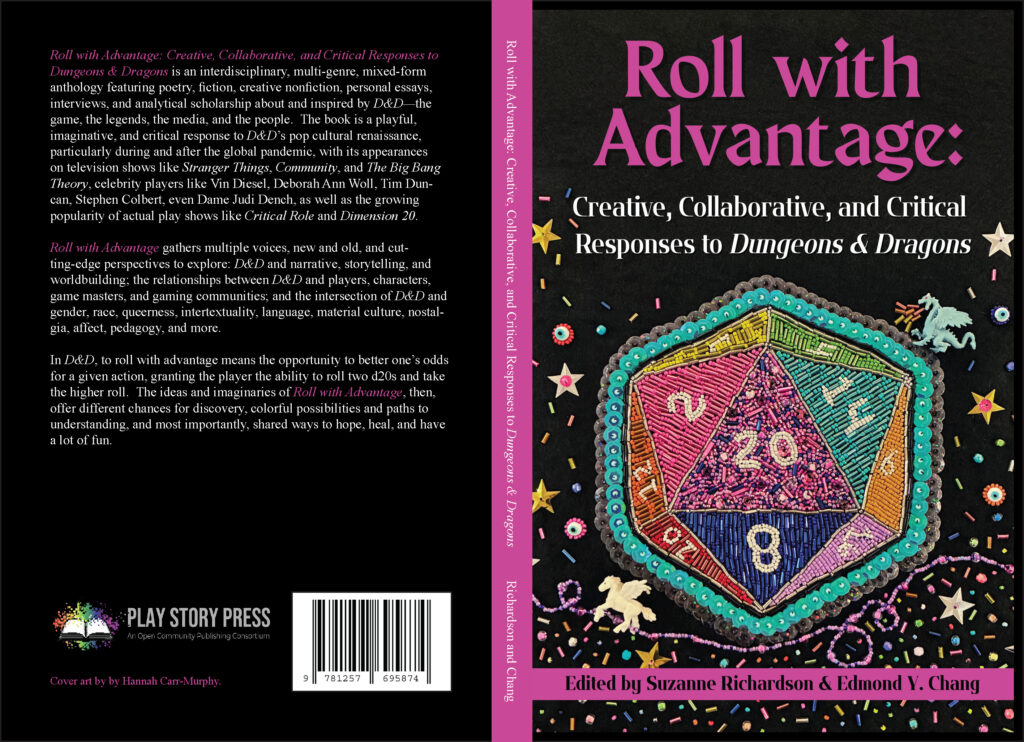 In 2020, in the midst of the pandemic, I came across a call for submissions looking for academic and creative writing about Dungeons & Dragons; the initial CFP was for an edited collection called Roll 4 Initiative. I decided to write something for the collection and submitted a poem entitled “Dice.” The poem offered brief vignettes of playing D&D for the first time as a high schooler, what those initial experiences meant to me, and how they would shape me in the years to follow. Luckily, the poem was accepted. Unfortunately, the collection would suffer a few challenges and stalls and stumbles, and years would go by. In 2023, I reached out to Suzanne Richardson, who was then heading the project solo, and asked if I could help. After a few discussions, she agreed to bring me on as co-editor, and we were off to the races. We worked diligently over the past two years, and now I am proud to present the finished book retitled Roll with Advantage: Creative, Collaborative, and Critical Responses to Dungeons & Dragons (Play Story Press, 2025).