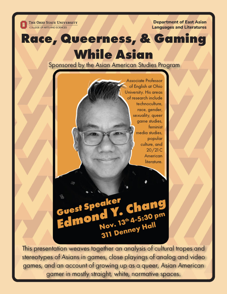 I have the great fortune of (finally) making it up to Ohio State University to do a talk for the Asian American Studies program. Thanks to Drs. Keita Moore and Joe Ponce for the invitation and making all of the arrangements. I will give a version of my “Gaming While Asian” talk, which is adapted from the essay of the same name that appears in Made in Asia/America: Why Video Games Were Never (Really) about Us (Duke University Press, 2024), edited by Tara Fickle and Christopher Patterson. My talk is on Thursday, November 13, 2025, in 311 Denney Hall. Then, on Friday, I will do a more informat chat with faculty and graduate students about my other/current work. It is a really great opportunity, and I am excited to visit OSU–I have never been to the campus even though I have been in Ohio for a while now.